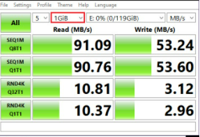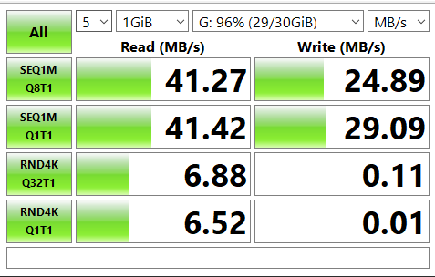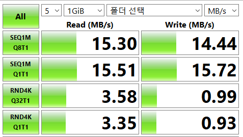 저렴이 삼성 microSD 64GB Class 1 제품을 블랙박스에 사용해 보기전 속도를 측정하니 결과가 다음과 같았다.